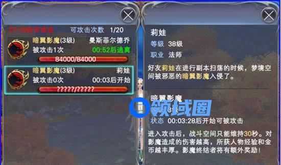 梦境空间内并不是永远那么和谐宁静的。当主人在大世界忙碌,比如扫荡副本之时,他的梦境空间,有可能会被邪恶的影魔乘虚侵入,对魅灵造成威胁!玩家或者好友都可以前往梦境空间对影魔进行挑战剿灭。每一位挑战者都将获得大量的人物经验和金币战利品。