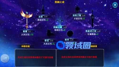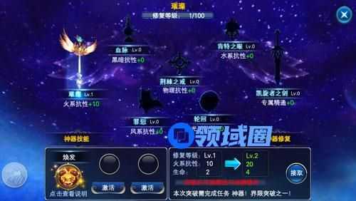 每一件刚刚获得的神器是残缺的,玩家需要做的就是不断的对其进行修补、突破、再修补,直至进阶、强化到神器的巅峰状态。神器所提供的人物属性也将在此过程中逐渐加强。