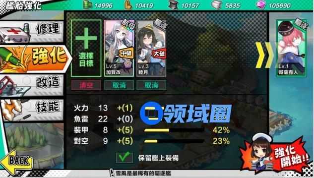 强化通过消耗多余舰船,可以提升舰船的火力、装甲、鱼雷、对空四个固定属性。消耗不同的舰种提升的属性不同,稀有度越高,提升的属性越高。当舰船的属性到达上限后,将不再提升。