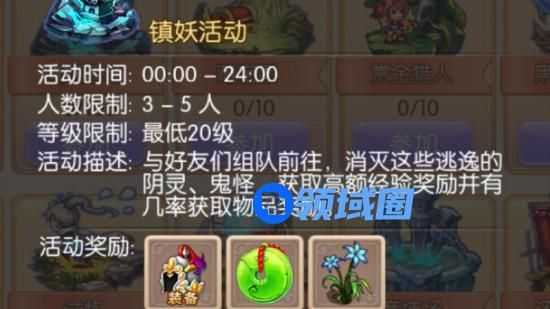 (2)镇妖活动为组队活动,玩家需要通过组队凑成3人(含3人)以上队伍,空余队员由队长仙侣补齐。