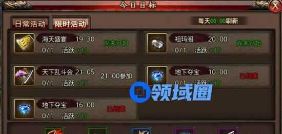 限时活动是在指定时间段开启的、全服都可以参与的大型活动。活动类型有需要PK争抢的地下夺宝,也有需要兄弟配合完成的祖玛阁。其奖励的丰富程度,足以促使你在活动时间段内上线参加。