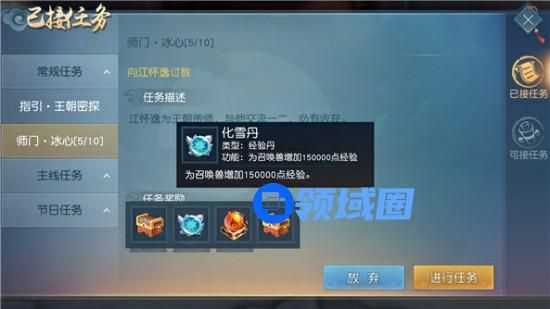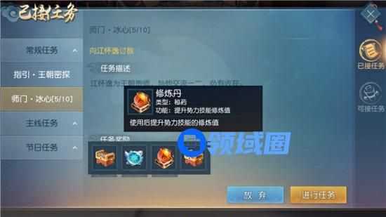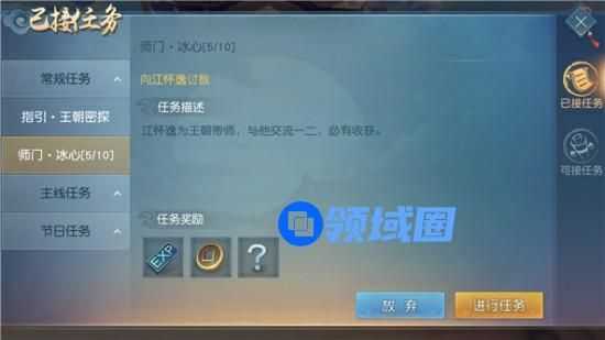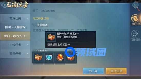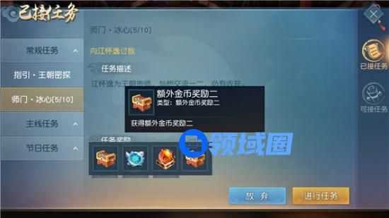 玩家在做师门任务的时候,每到第10次都是百分百几率获取第三项物品奖励,前两项的经验以及金币是百分百获取的。