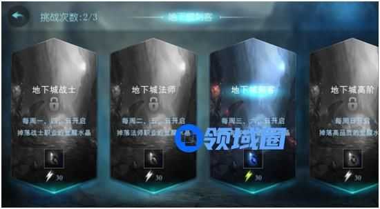 奇遇:地下城每天有3次挑战机会,每次花费30体力。每周一、四、日开启地下城战士,掉落战士职业的觉醒水晶;每周二、五、日开启地下城法师,掉落法师职业的觉醒水晶;每周三、六、日开启地下城刺客,掉落刺客职业的觉醒水晶;每周日开启地下城高阶,掉落高品质的觉醒水晶。