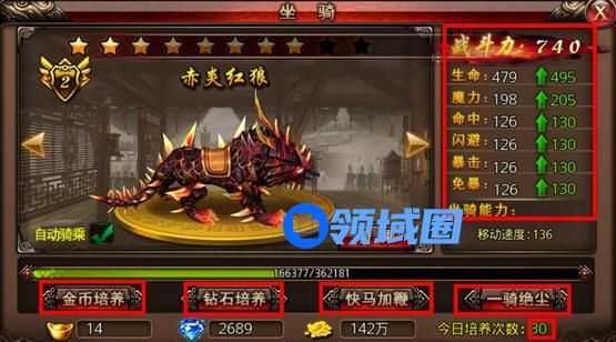 初阶的坐骑是踏雪飞马,每日可以使用金币、钻石或者元宝对坐骑进行培养升级,升级之后的坐骑属性会进一步提升。