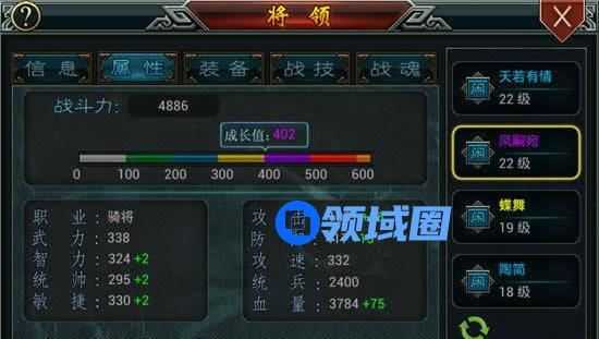 如下图所示,紫色武将是从酒馆招募的,酒馆招募的紫色武将初始成长好像都是400,然后点击将领管理,对其进行培养,我培养了2点,现在的成长值是402, 培养之后,武将的各项属性都会有一点点的增加,积少成多,当你把武将培养到暗金色以后,就算是普通武将,那也是相当牛的。