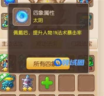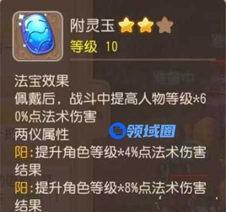 三个两仪属性能为玩家带来7%+5.6%+7%=19.6%法术伤害*等级的提升。再加上10层法宝自身属性60%*等级,那么该附灵玉能为玩家带来的总属性加成为19.6%+60%=79.6%。