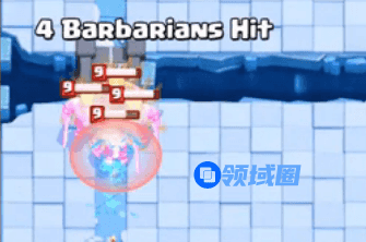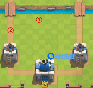 假若对面野蛮人是呈抱团状过河的,我们就可以放在②处直接对其进行冰冻,同时让对面的野蛮人也承受到我方公主塔的伤害。