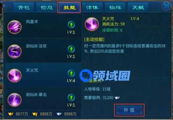 2、使用技能书后,即可学习相应技能,再点开人物--技能,点击“升级”就可以升级该技能。升级主动技能可以提升主动技能的伤害或功效;