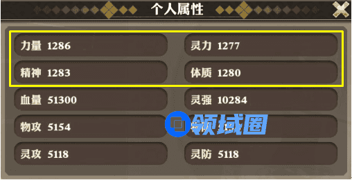 这些属性可以简单的分为4大类:力量、灵力、体质、精神。