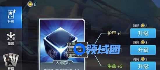 每张芯片都会有3条属性,分别由护甲、法抗、生命、攻击、冷却等组合而成。属性可以进行升级与重置: