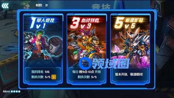 目前竞技系统分为三种模式,已开放的有两种,1v1和3v3。
