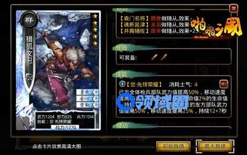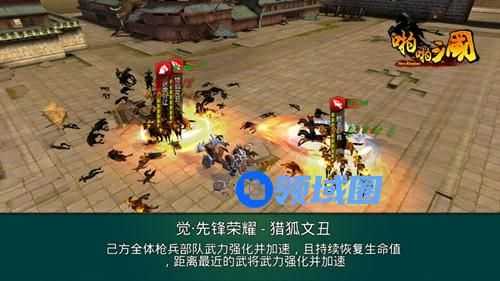 猎狐文丑的枪兵号令优势在于,除了提升武力值外,还附带提升移动速度和生命恢复,加上小buff的二次加成,可使己方枪兵核心武力和速度迅速达到最大化,但是需要注意的是,buff持续时间不算长,并且小buff比较吃武将位置,需要各位主公注意武将站位和把握技能释放时机。