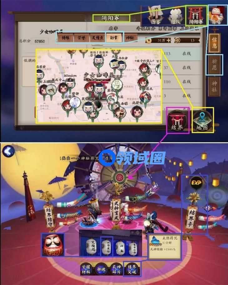 当你成功进入阴阳寮之后,就会看到如图所示的主界面,这时我们要做的第一件事,就是摆放属于自己的结界