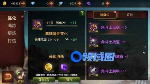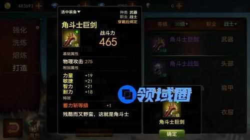 首先还是从头像下隐藏的菜单栏里点开装备按钮,很直观地看到《永恒》的装备系统下包含四部分:强化、洗练、熔炼和打造。所谓强化,也有升级的意味,就是把低级装备强化成高级装备,能使装备的基础属性得到直接提升。强化装备需要消耗金钱和强化石,钱都好说,强化石的获取就要下点功夫了,可以通过参加单人副本,守卫地牢等多人副本的方式获取,不过你要是有钱任性,直接用钻石购买最便捷了。