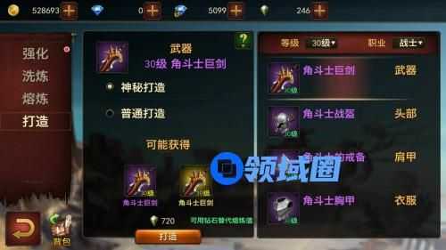 装备打造分为普通打造和神秘打造,普通打造每次刷新时会在当前等级段中抽取一件本职业装备,而神秘打造可能打造出紫色和金色装备。打造装备需要熔炼值,当熔炼值不够的时候,可用钻石代替哦(有钱真好~QAQ)。