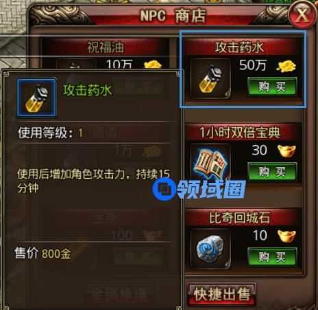 攻击药水可以在随身商店中花费50W金币购买,使用后会在15分钟内提高角色的攻击力。我们打怪赚金币是为了什么?当然是花掉啊!购买攻击药水绝对不花冤枉钱!