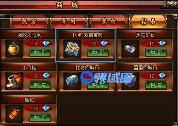 一小时双倍宝典前文有提到过,是焰火屠魔的最佳伴侣。值得提醒的是双倍宝典可以通过随身商店用元宝购买,也可以在钻石商城中用钻石购买。游戏每天可以获得大量的钻石,多存几本双倍宝典绝不吃亏!