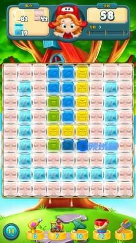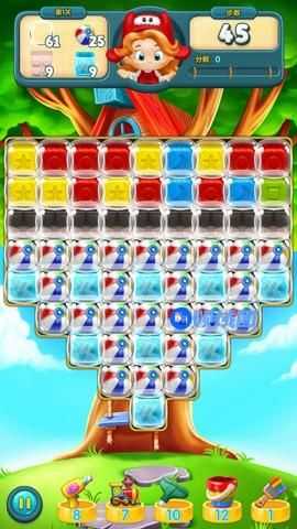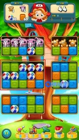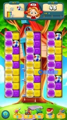 作为树屋的第一个关卡,主要是让各位适应一下树屋的玩法。开局的两行方块是不足以凑成组合道具的,我们需要做的是从一侧开始打开积木,并且消除一定数量的沙滩球和冰块,为组合道具创造空间。左侧还是右侧都一样,取决于开局的方块布局,或者你自己的喜好。
