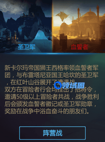 红叶山谷分为两个阵营,隶属于狮王西格的血誓者(红方)和效力于国王哈坎的圣卫军(蓝方)当服务器达到第二纪元时,冒险者们便可以公会为单位加入阵营了(只能由会长、副会长或者执法官选择加入)。