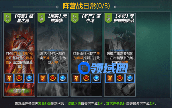 完成日常任务、事件都可以为阵营贡献不同的资源值。分为“木材”、“矿产”、“果实”。这些资源会提升我方阵营的战斗力。