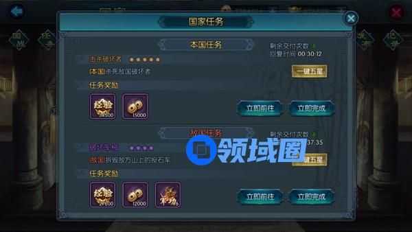 当玩家的等级达到一定等级后,便会开启日常与国家任务。这两项任务会获得大量的经验,而且国家任务的次数是会随着时间的流逝而慢慢恢复的,所以要优先完成国家任务。