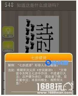 大家仔细数一数能看出图中的脚印有7个,七步之后就成了一首诗,这个著名的故事相信大家都有听过,既然已经给出了提升是七步诗,那么成语也只有“七步成诗”了。