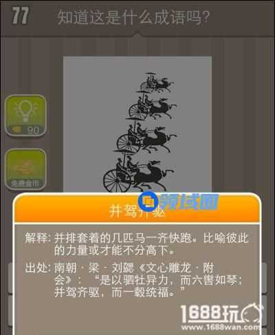 如果玩家们把这图上的马车都看成一个整体,可以发现这4辆马车行进地非常整齐,“并驾齐驱”这个成语也不难猜出来了。