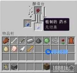 玻璃是使用沙子合成的,三块玻璃按照上图摆放就能制造出玻璃瓶了。拿着空瓶对着有水的地方右键就可以装水了。有了酿造台和水瓶,我们就可以开始酿造药水了,常见的炼药材料有:红石、萤石粉、地狱疣、蜘蛛眼、幽魂泪……等等。大家都知道不同药水有不同的作用,小编不需要多说了。