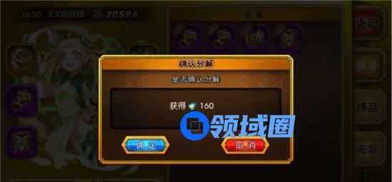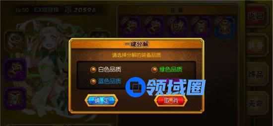 最后一个功能就是分解,单独分解或者一键分解都会获得精铁,一键分解功能还体贴地加入了品级选择以便保留品级较高的装备。