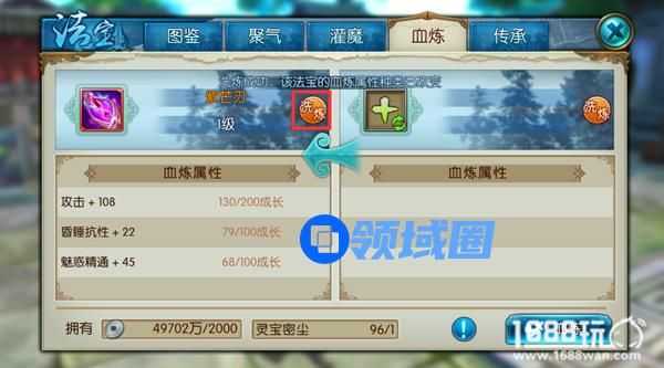 在到达一定等级后,玩家们就可以使用法宝血炼提升法宝的附加属性。但是属性加成栏目有限,如果想替换掉不想要的属性就需要消耗到灵宝秘尘。