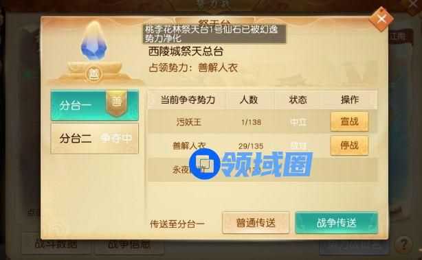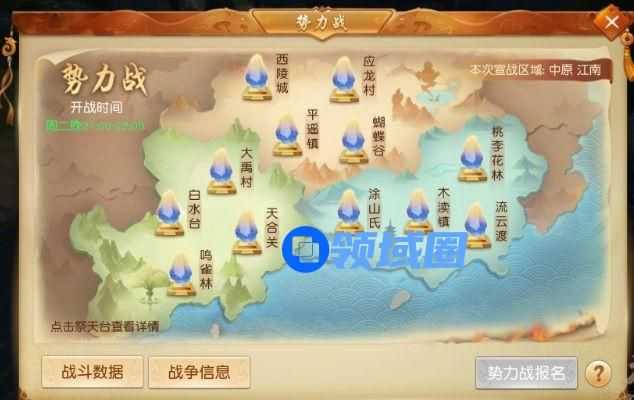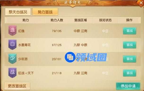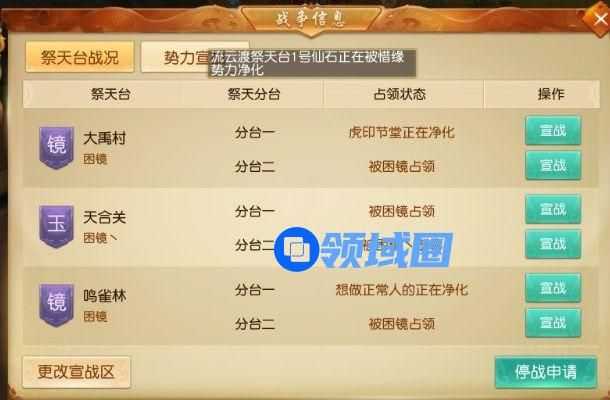 势力战是对3个地区的12个祭天台进行争夺的玩法。并且每个祭天台有两个分台。这里可以对一个或者多个势力宣战,不过最好根据己方的实力进行宣战,