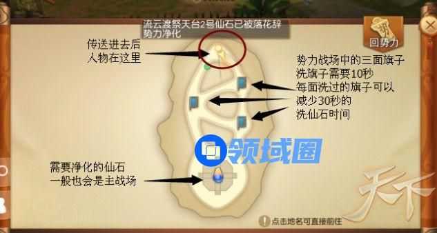 普通传送进去后,先在门口集合一下。然后一起向另一个方向的仙石处移动,沿途有三面旗子,每洗一面旗子需要10秒的时间,