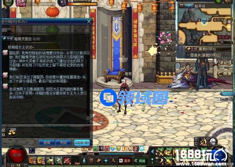 地下城暗精灵遗迹的开启前置任务就是外传任务,按下F1,在未完成任务里找到这个暗精灵遗迹外传任务,接下。任务要求是让你去和梅娅女王谈谈。