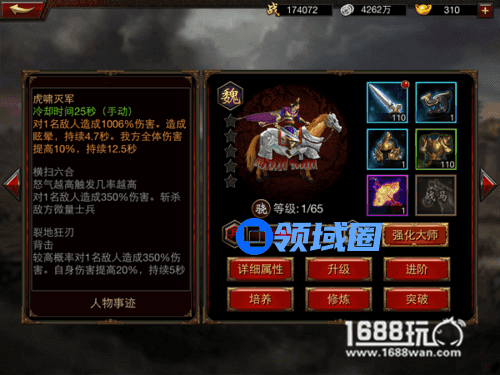 虎啸灭军,对于一名敌人造成大量伤害,并眩晕长达4.7秒,提升全体伤害。