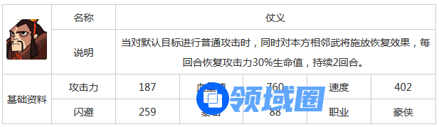 当对默认目标进行普通攻击时,同时对本方相邻武将施放恢复效果,每回合恢复攻击力30%生命值,持续2回合。此技能类似张开的技能【驰援】当受到伤害时,立即对左右相邻武将释放恢复效果,每回合恢复攻击力25%的生命值,持续2回合。