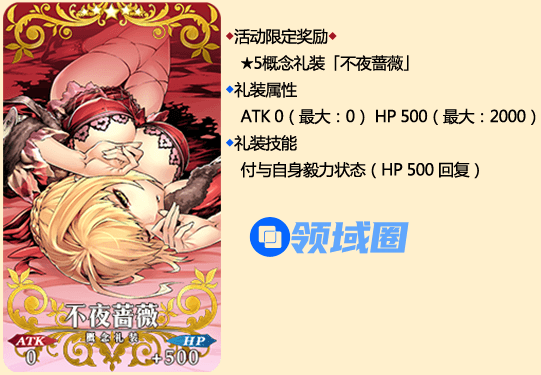 首先要说一下毅力状态,很多玩家可能不清楚毅力是什么状态,毅力状态是指从者受到致死伤害时,能够不退场并且回复一定的血量,不过下次再受到致命伤时,就要下场了,那么我们再看一下礼装,作为五星礼装不加成ATK却增加了大量的HP并且带有毅力状态,那么首先要清楚她的定位,不夜蔷薇并不是加成输出的礼装,而是彻彻底底的防御型礼装。