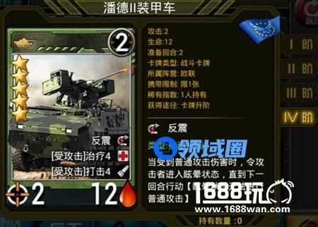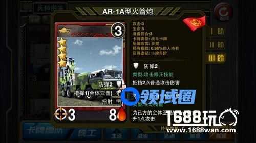 二就是要保证回合数不能过多,二待机比较合适,一待机最好,不过我还没见过一待机的扫射卡,不知道以后会不会出。三待机的就不太好了,毕竟多一次待机就少一轮输出,还得多吃一轮伤害。但是也不是绝对如此。比如亚盟的四星卡牌AR-1A型火箭炮,3攻8血,防弹2,亚盟全体指挥1,虽然也是三待机,但是在扫射卡里还是相当实用的,本身带防弹可以保证一定的生存能力,然后是亚盟全体指挥技能,如果有几张这样的卡同时出现,从理论上讲,攻击还是能够叠加到相当可观的程度,不过,此套路不太现实。