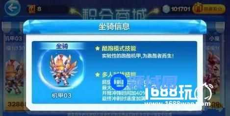 机甲03实验性的跑酷机甲,为酷跑者而生!,造型酷炫,太空漫步也是萌装坐骑,经典模式得分加成不是非常高,不过技术好还可以,机甲03也是萌装建议收藏合适,爆分要培养其他坐骑会更高!