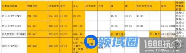 1、在天域还未推出前,当前版本太虚最好的武器为70手工金武器(完美属性参考表中最优选择统计)