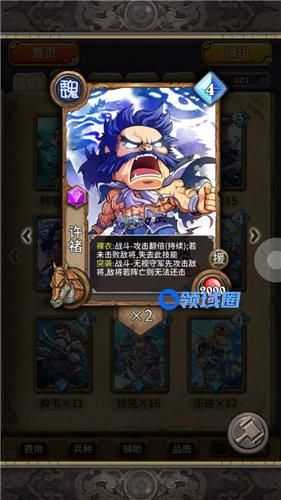许褚,4费2000兵,骑兵援军,技能裸衣突袭。就单卡的技能而言,新手往往会拿他与乐进做比较,一个是4000突袭2000兵,一个是3000突袭 3000兵,但许褚却是紫卡,所以新手容易认为许褚更强。但实际上,许褚多的1000攻击完全可以在需要的时候用援军代替,而且兵力较低容易在开始突袭之前残废甚至夭折。不过,许褚的强度在裸衣变为持续之后有所改善。在不考虑法伤的前提下,许褚可以当做小曹操,第一回合4000攻的突袭,第二回合4000攻,在校场练兵中许褚就是曹操的替代品。