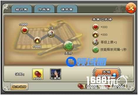 此次武将突破将在武将界面中新增突破功能,每个武将在觉醒后,自动开启突破,觉醒武将图鉴会显示已开放突破武将的全满属性。同时会开放3篇兵法的突破:始计篇、作战篇、谋攻篇,每个篇章分为领悟跟突破两个阶段。