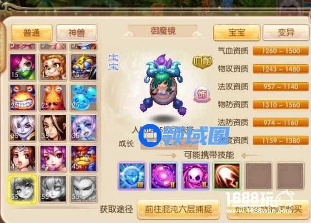 属性:血耐,御魔镜是55级可携带三种宠物里面气血资质、物防资质和法防资质最好的宝宝。是可以起到吸收伤害充当前排的宝宝。