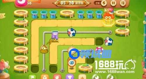 这关的障碍物并不算多,而且都是直线排列的,用玩具飞机清,减速炮塔一开始选择蘑菇。
