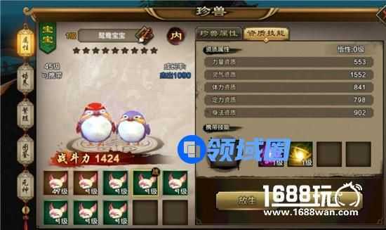 在有了自己心仪的珍兽之后,我们可以通过培养来打造强力的珍兽。首先是宝宝型的珍兽,在宝宝型的珍兽没有繁殖之前,我们可以通过洗炼丹来提升珍兽的成长率,成长率在游戏中分为四种,从低到高分为,优秀,杰出,卓越,完美。成长率越好的宝宝,属性成长就越高。然后是二代珍兽,二代珍兽的成长率是根据繁殖的宝宝来定的,不可以再培养,二代珍兽可以培养的属性是悟性,悟性等级从低级到高级,每一级都可以增加珍兽的资质,可以大幅度的提升珍兽的属性。悟性培养可以通过根骨丹来培养,悟性等级越高成功率就会越低,所以想获得一个高悟性的珍兽还是比较困难的。最后是技能培养,珍兽的技能可以从初始的1级通过技能培养增加。可以用同样的技能书来进行升级,等级越高成功率也就越低。