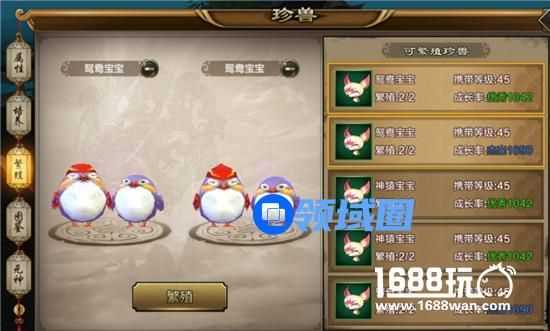 每种珍兽都可以通过繁殖来获取二代珍兽,繁殖需要同种的珍兽宝宝来进行。珍兽宝宝可以在游戏中的玄武岛捕捉,或者再商城中直接购买。宝宝繁殖之前可以先提升一下成长率,二代珍兽的成长率会继承宝宝珍兽的成长率。两个不同成长率的宝宝繁殖出来的二代珍兽会在两个宝宝的成长率中随机选择,所以宝宝的成长率是越高越好。繁殖出来的二代珍兽会带有星级,星级越高珍兽的资质就会越好,并且外形会在不同星时发生变化,会变得非常的炫酷,华丽。
