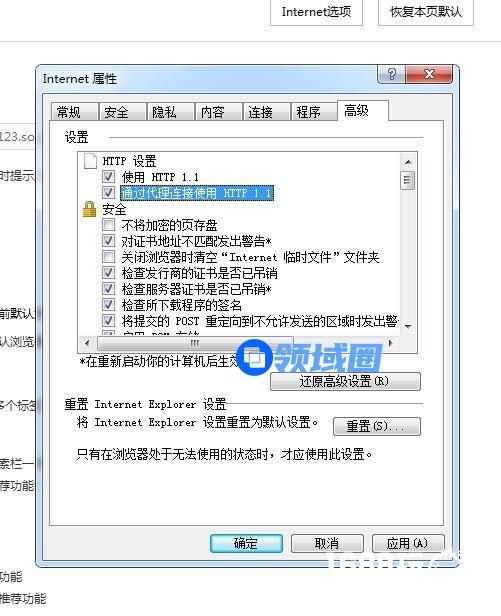 2、打开任意一款浏览器,打开工具栏Internet选项,高级选项中将“使用HTTP1.1”和“通过代理链接使用HTTP1.1”前面的勾选去掉。再重新打开游戏客户端尝试一次。