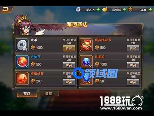 玩家可以凭借声望,在军团商店中兑换进阶丹、银币等物品。