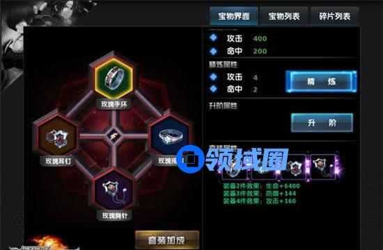 宝物分为4大类,当装备4件品阶一样的宝物可以激活套装属性。宝物又可以进行精炼和升阶来提高属性,精炼和升阶不可继承给下一件宝物,但可以通过重生来返还所有材料,玩家可以使用这些返还的材料给新宝物精炼和升阶。