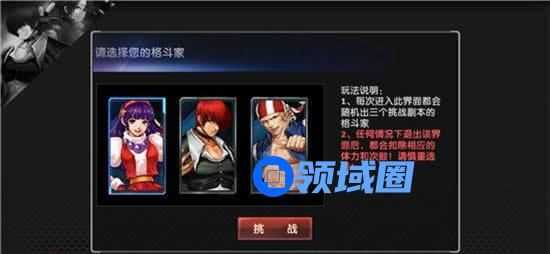 选择关卡后开始,系统会随机抽取三名格斗家,玩家在这三名格斗家中选择一个进入副本战斗,击杀最终boss为通关条件。