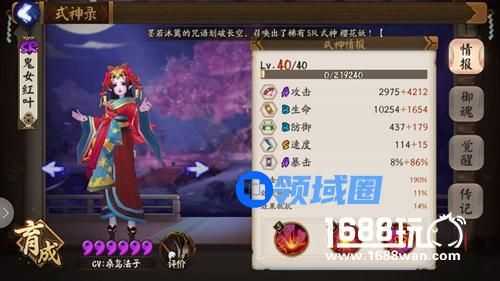 鬼女红叶是我的第三只SR,如果第二只SR不是咕咕鸟,我想我的红叶至少也是四星的……我们先来看一下6星红叶的面板,A级的攻击成长,40级满的攻击有2975,算是A级成长里最高的了,不过和S级的咕咕鸟就差了107点白字。